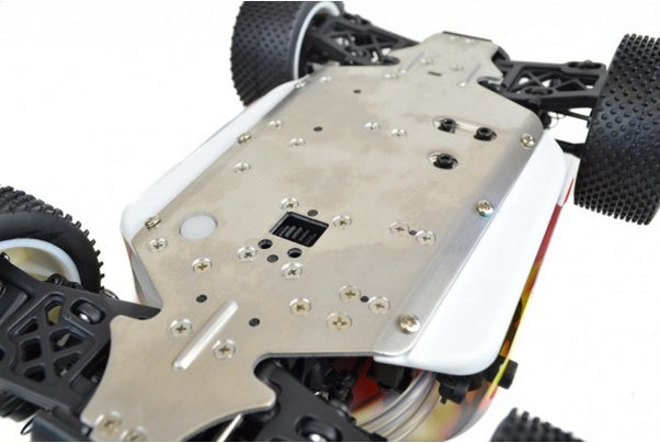 The buggy is built around a solid aluminium chassis, providing a rigid base that resists flex during hard acceleration and jumps. Countersunk screws ensure a smooth underside for better ground clearance.