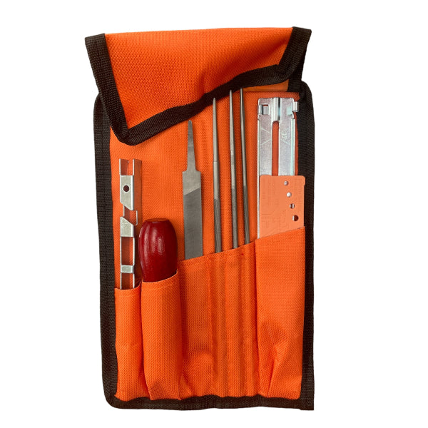 Material: Hardened steel (files), metal (gauges and cleaner), nylon/plastic (handle), canvas (pouch)