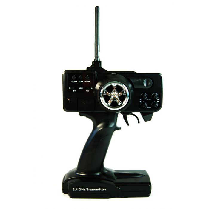 The included wheel-type 2.4GHz transmitter offers interference-free operation, rapid signal response, and the convenience of running multiple cars simultaneously without channel management. Steering inputs are precise and quick, making it easier to control countersteering during drift transitions.